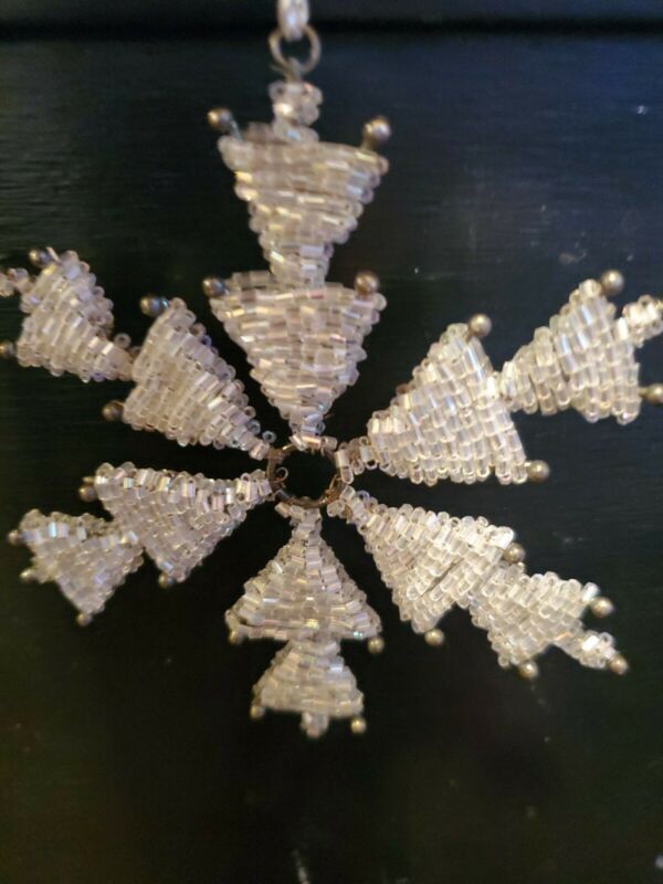 Title (ebay affiliate link): Antique White Glass Beaded Wire Wrapped Christmas Ornament Snowflake Star