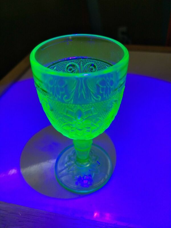 Title (ebay affiliate link): Uranium Glass 4" Tall Stemmed Cup "Sandwich" Indiana Pattern Depression Glass