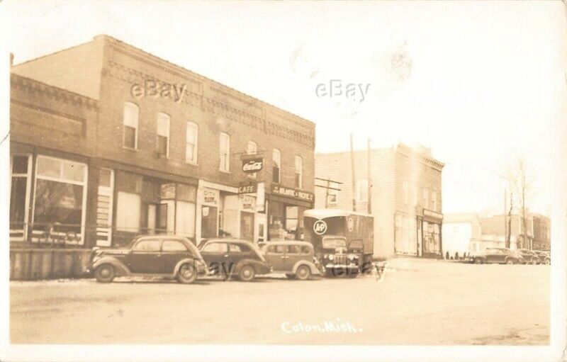 VINTAGE MICHIGAN RPPC REAL PHOTO POSTCARD COLON STREET SCENE COCA-COLA A&P TRUCK