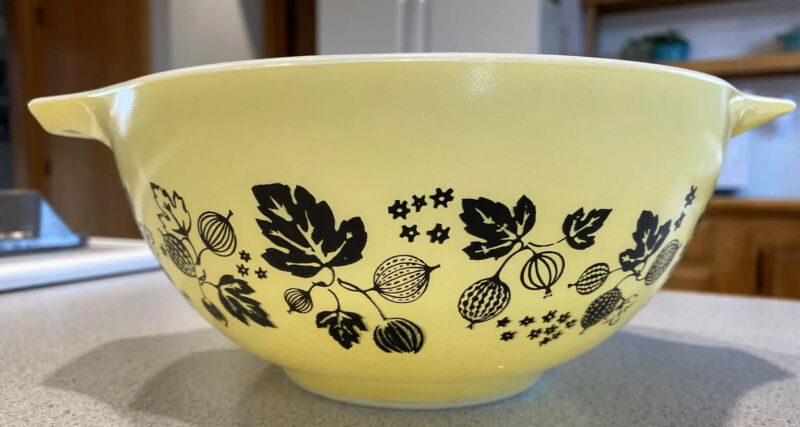 Title (ebay affiliate link): VINTAGE 1 1/2 QT. PYREX GOOSEBERRY YELLOW BLACK MIXING BOWL #442