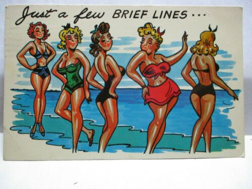 1962 RISQUE POSTCARD " JUST A FEW BRIEF LINES " GIRLS IN BIKINI''S AT BEACH