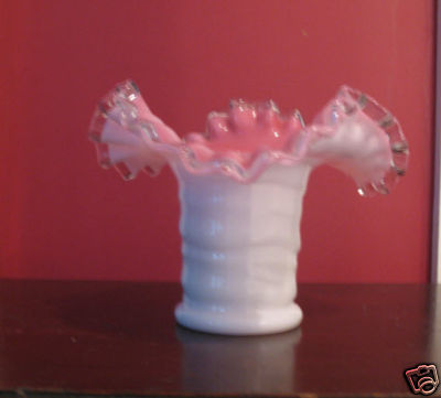 Vintage Fenton Milk Glass Hat Vase with Pink Ruffletop