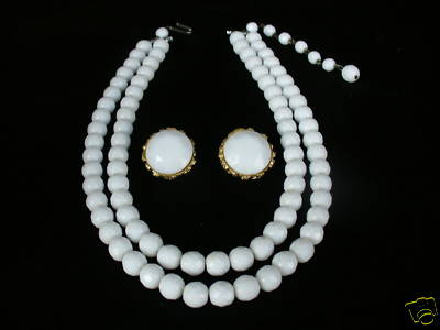 2STRD CUT MILK GLASS BEADED CHOKER NECKLACE & EARRINGS