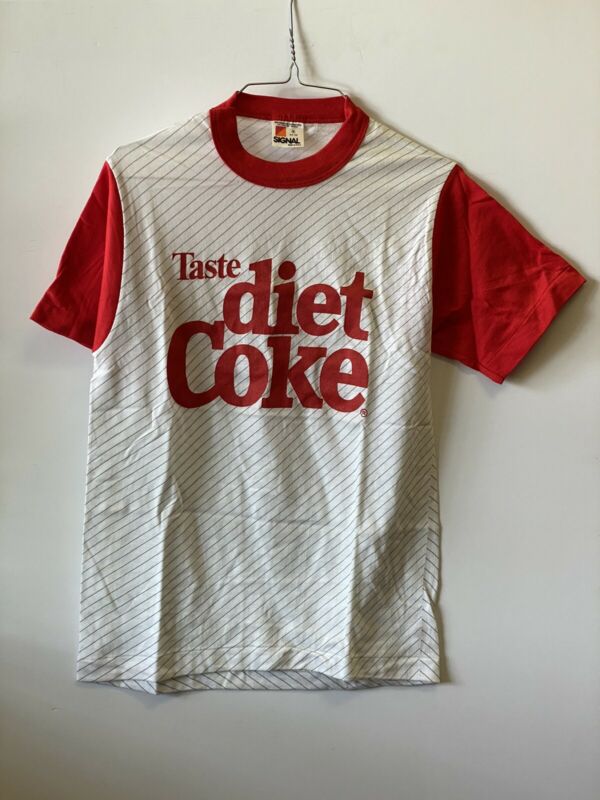 Title (ebay affiliate link): Vintage 1980s Diet Coca Cola T-Shirt Signal Size Small 34-36 White Striped Red