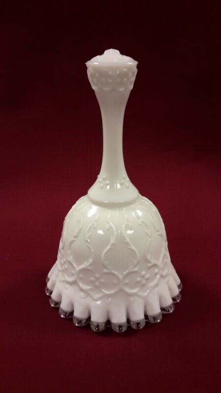 Title (ebay affiliate link): Fenton White Milk Glass Bell w/Spanish Lace Pattern and Silver Crest Ruffle Rim