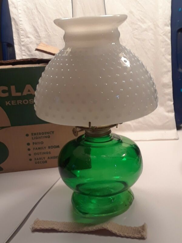 Title (ebay affiliate link): Vintage Jeanette 15" Green with Milk Glass Hobnail Oil Lamp with Original Box