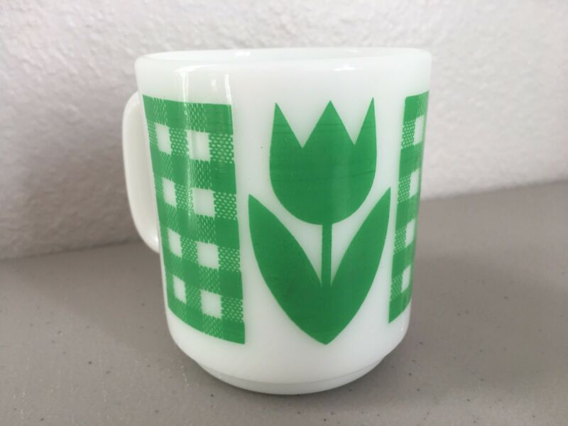 Title (ebay affiliate link): Vintage Green Tulip Gingham Plaid Coffee Cup Mug Milk Glass