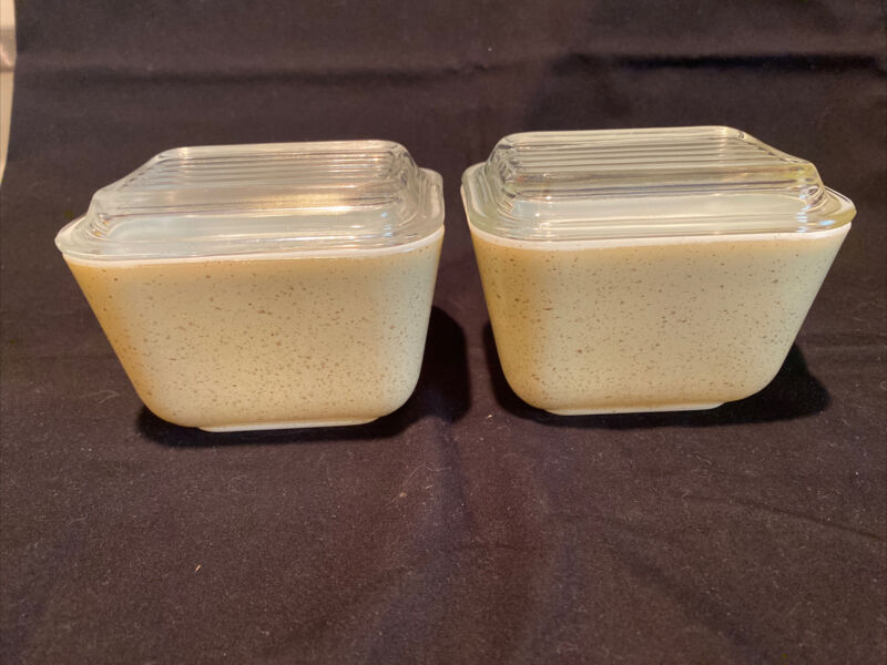 2 Vintage Pyrex Refrigerator Dish Homestead With Lids 12 Ounce Tan Brown Specs