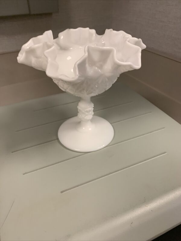 Title (ebay affiliate link): VINTAGE FENTON MILK GLASS LACEY TYPE PATTERN COMPOTE, MINT CONDITION!