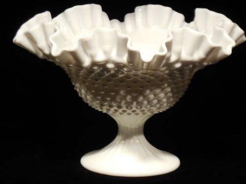 Large Vintage Fenton White Milk Glass Hobnail Pedestal Vase Ruffled Rim