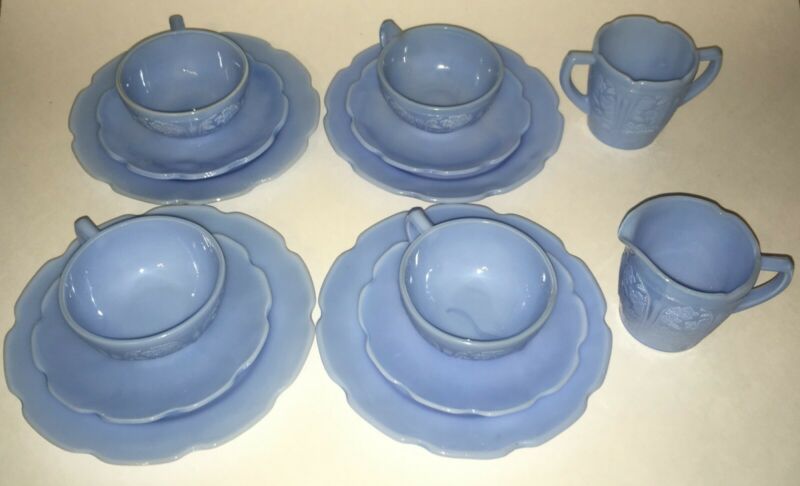 Lot 14 Pieces Cherry Blossom Delphite Blue Milk Glass Jeanette Glass Plates, Cup