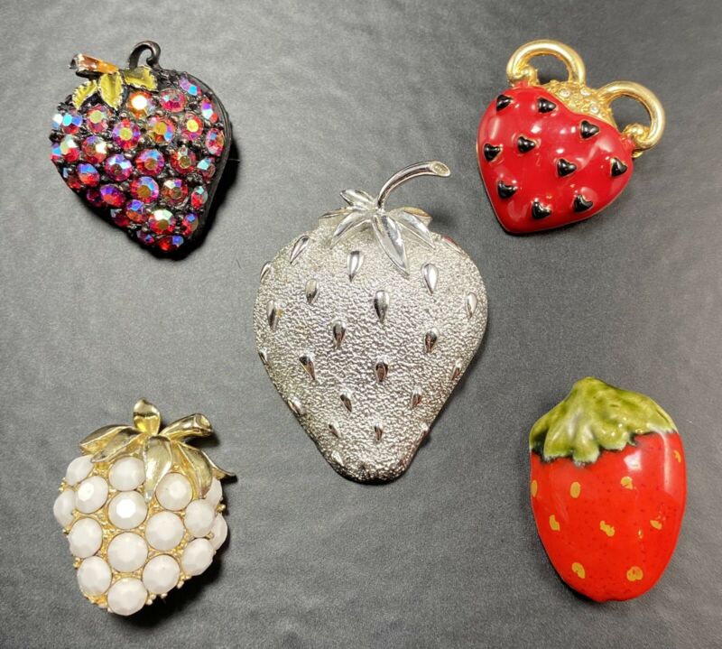 Title (ebay affiliate link): Vintage Strawberry Brooch Pins 5pc Milk Glass Rhinestones Sarah AAI Lot3
