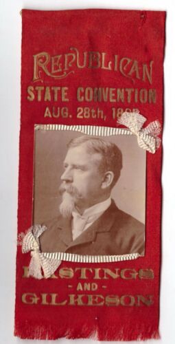 Title (ebay affiliate link): 1895 SILK RIBBON PA. GOV. DANIEL HASTINGS & B .F. GILKESON CHAIR 2 3/4" X 6 1/4"