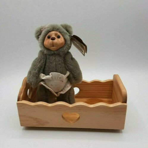Vtg Robert Raikes Signed Wooden Face Baby Bear Alison 38521 w/ Cradle