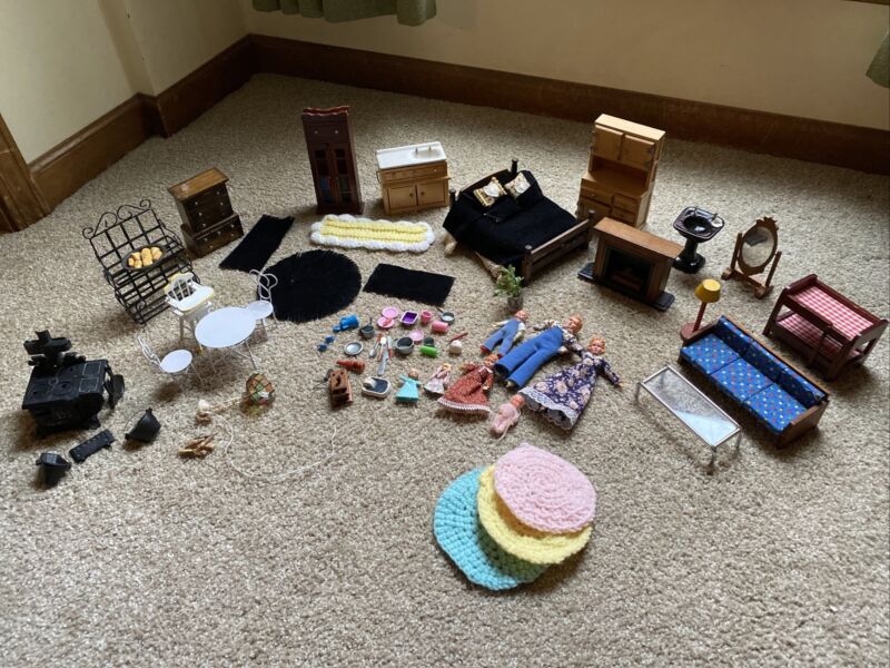 Title (ebay affiliate link): Vintage Dollhouse Furniture, Housewares, Dolls, 1970s; over 60 pieces