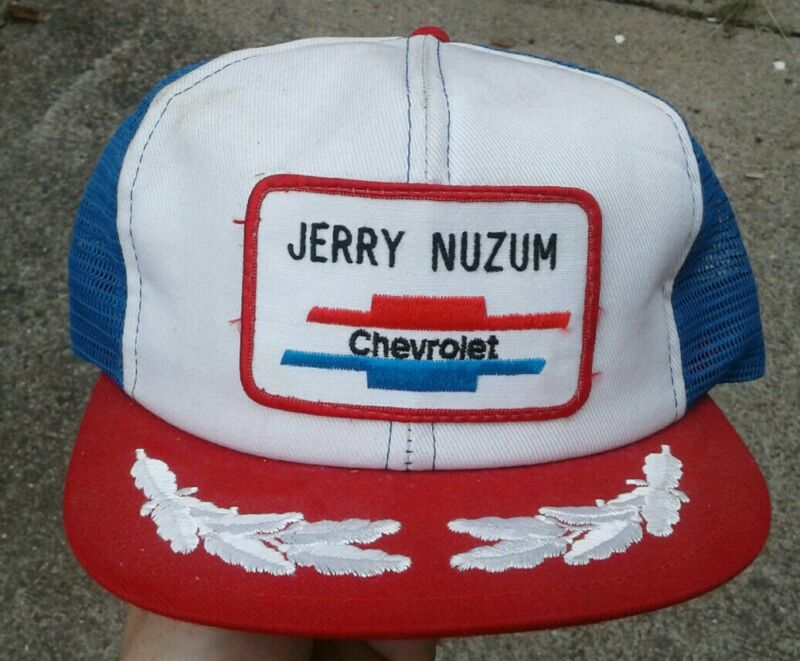 Title (ebay affiliate link): Chevrolet Chevy JERRY NUZUM CAR DEALER TRUCKER HAT PATCH USA RED WHITE BLUE VTG