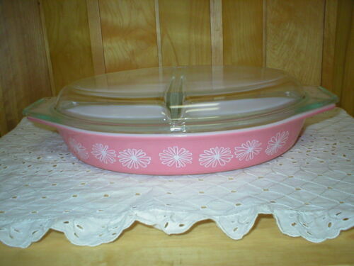 Title (ebay affiliate link): Vintage Pyrex Pink Daisy Divided Casserole Dish w/Lid 1 1/2 quart Oval