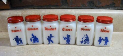 Title (ebay affiliate link): 6 VINTAGE SPICE SET JARS WITH DUTCH FIGURES AND SHAKER TOPS MILK GLASS