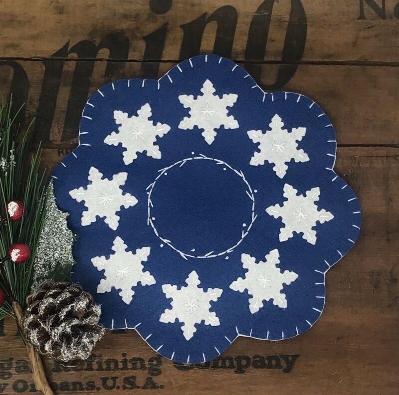 Title (ebay affiliate link): Primitive Stitchery CHRISTMAS Snowflakes Penny Rug ~ Winter Candle Mat
