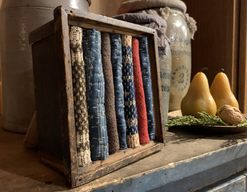 Title (ebay affiliate link): Early Box W/ Scrapes Of Blue Calico Brown Navy Coverlet & Red Brown Lindsey