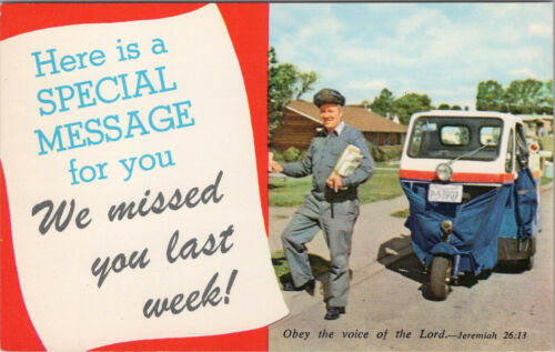 Vintage chrome rally day postcard, sorry we missed you, postal carrier w/ truck