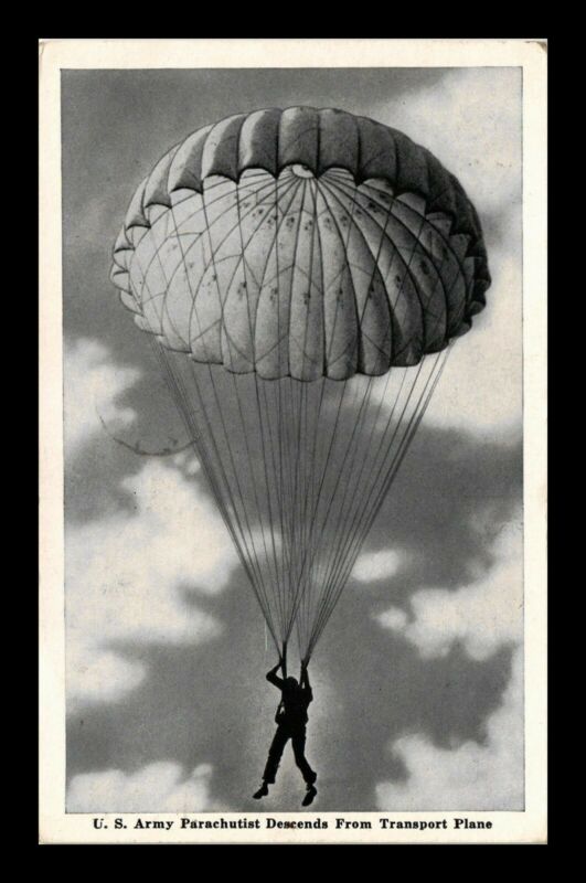 Title (ebay affiliate link): DR JIM STAMPS US ARMY PARACHUTIST DESCENDS TRANSPORT PLANE WWII POSTCARD