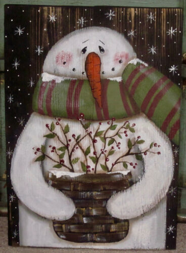 *~*PRIMITIVE*~* HP FOLK ART PRIM SNOWMAN * BASKET * WINTER *~* RECLAIMED WOOD