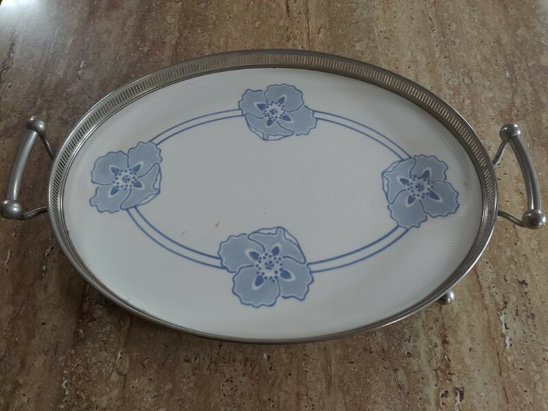 Antique Porcelain & Silver Tone Metal Serving Tray with Blue Flowers