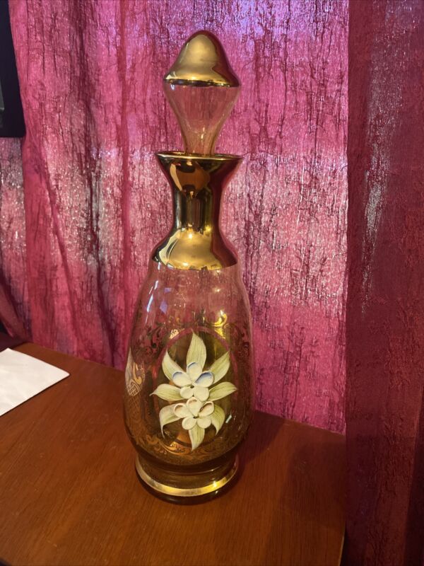 Title (ebay affiliate link): Vintage Bohemian Hand Painted Amber Glass Decanter Bottle With Gold Trim