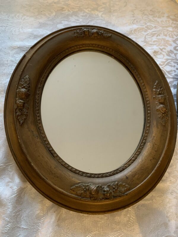 Antique Vintage Wood Carved Oval Frame Mirror with Acorns Brown Gold 14x12
