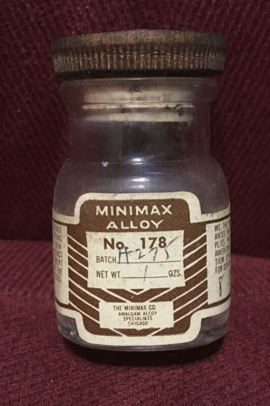 Title (ebay affiliate link): Antique Dental Bottle: Minimax Alloy, Silver for Dentist Amalgam. Embossed, Cork