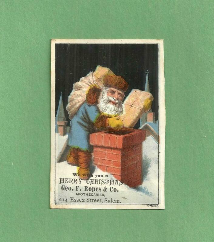 Title (ebay affiliate link): 1880 Christmas Trade Card GEORGE F ROPES APOTHECARY SALEM Blue Robed Santa Claus