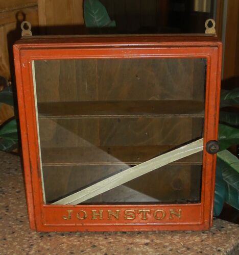 Antique Metal & Wood Johnston Store Advertising Three Shelf Cabinet