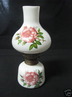 Vintage Milk Glass Miniature Oil Lamp with a Pink Rose.