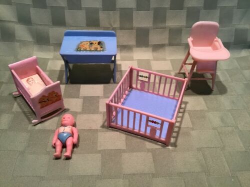 Title (ebay affiliate link): Lot Vintage Dollhouse Furniture Renwal Nursery Baby Play Pen High Chair Plus