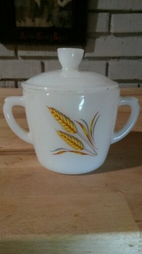Vintage Anchor Hocking Fire King Milk Glass Golden Wheat pattern Sugar With Lid