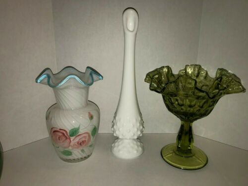 FENTON Vintage Flowered Vase White Milk Glass Vase Green Thumbprint Compote!