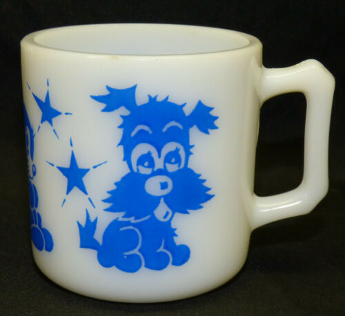Vtg Hazel Atlas White Milk Glass Child''s Mug Blue Bunny Duck Puppy Dog Animals