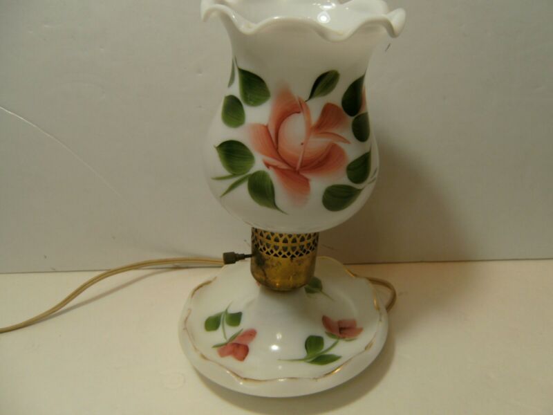 Title (ebay affiliate link): Vintage Milk Glass Hand Painted Pink Rose Vanity Boudoir Hurricane Lamp 9" Tall