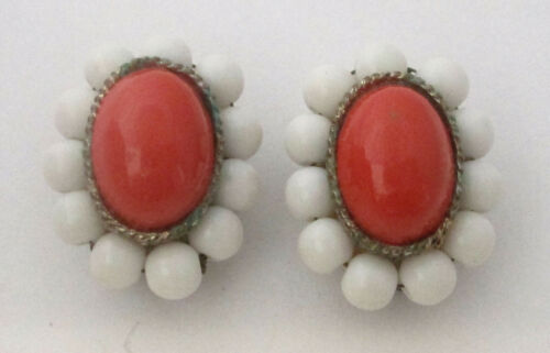 Vintage Milk Glass Bead/Coral-Pink Cabochon Earrings