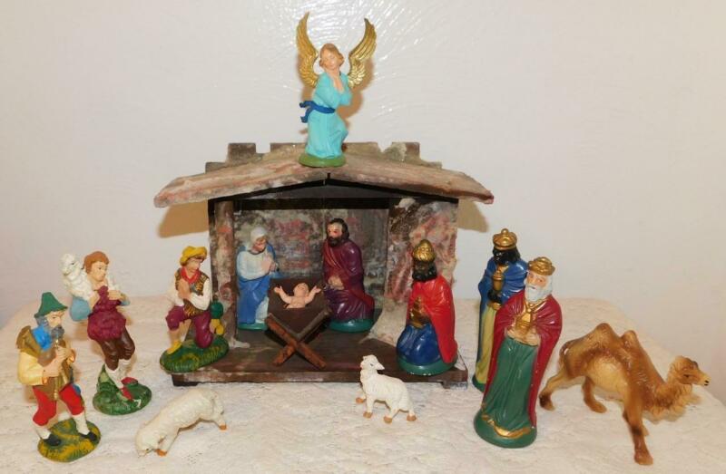 Vintage Christmas 15 Piece Nativity Figures & Creche Manger Depose Italy