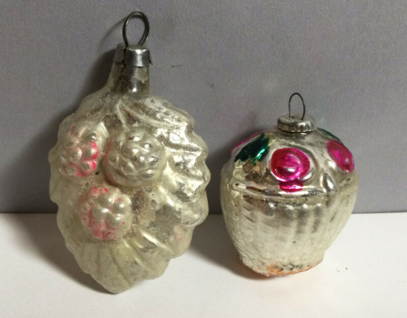 VINTAGE ANTIQUE LOT OF 2 FIGURAL HAND BLOWN MERCURY GLASS CHRISTMAS ORNAMENTS