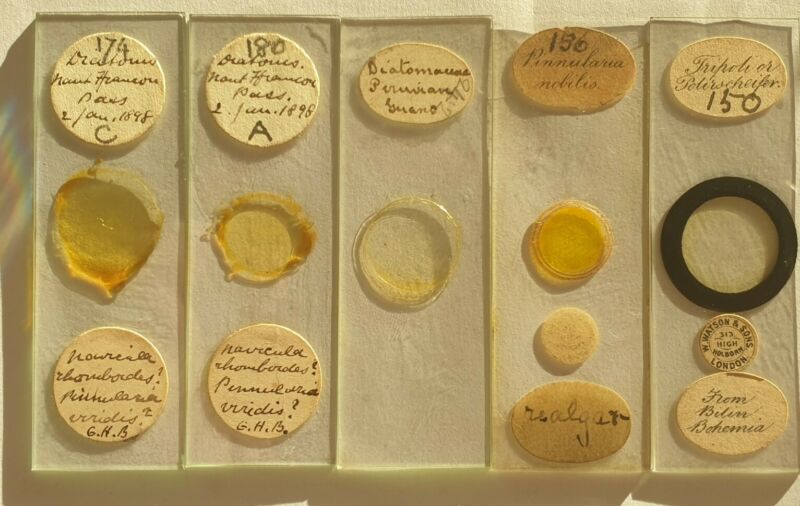 FINE GROUP OF 5 ANTIQUE DIATOM MICROSCOPE SLIDES