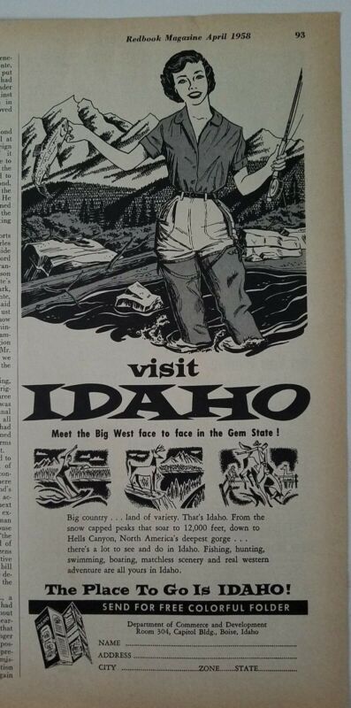 Title (ebay affiliate link): 1958 Sun Valley Idaho woman fisherman fishing waders vintage ad