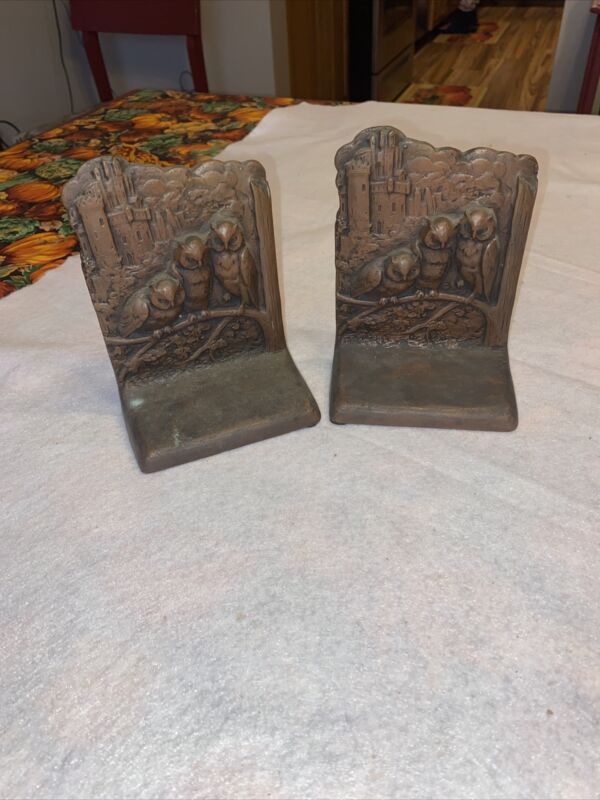 Title (ebay affiliate link): Antique Weidlich Brothers Heavy Bronze Bookends Pair Owl Family & Gothic Castle