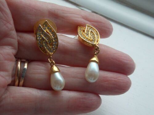 GORGEOUS PAIR OF VINTAGE BRIGHT GOLD PLATED CRYSTAL & FAUX PEARL DROP EARRINGS