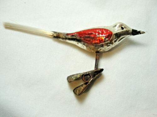 Vtg Blown Mercury Glass Bird w/ Spun Glass Tail +Clip Christmas Ornament Germany