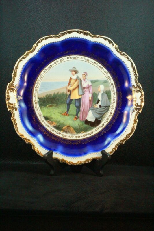 RARE ANTIQUE EMPIRE CHINA COBALT BLUE DECORATIVE PLATE. PILGRIM EXILES #4059.