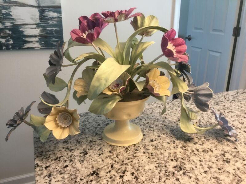 Vintage Italian Tole Floral Centerpiece Metal Flowers Italy Florentine Hand Dec