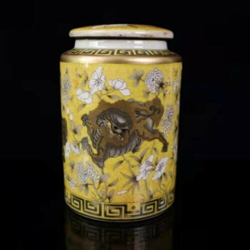 Title (ebay affiliate link): Chinese antique porcelain yellow ground ink color lion pattern lid tea jar